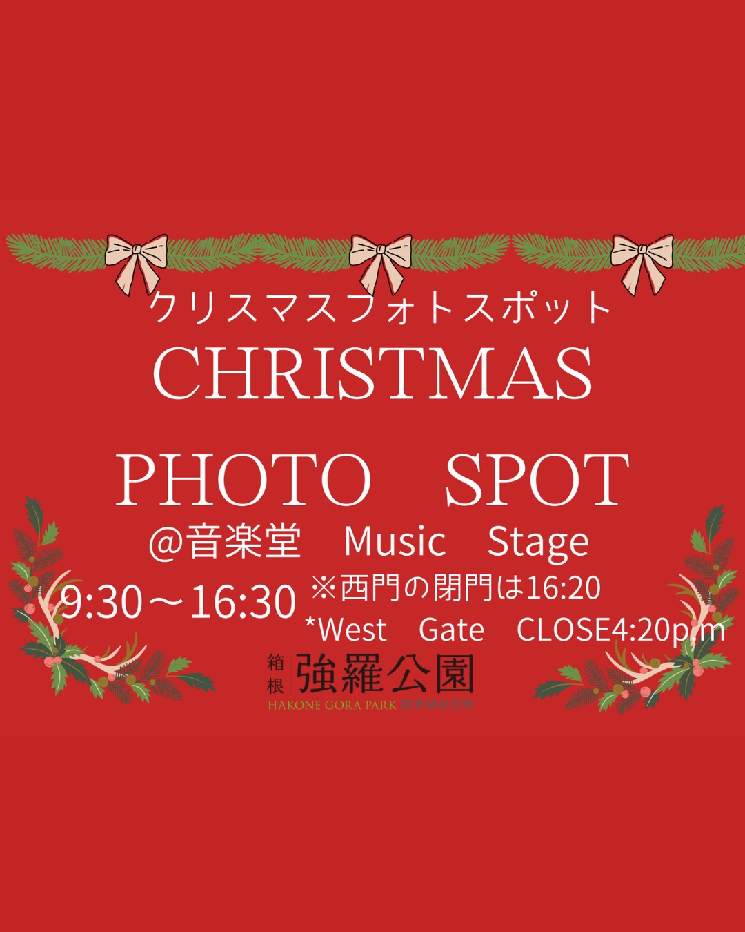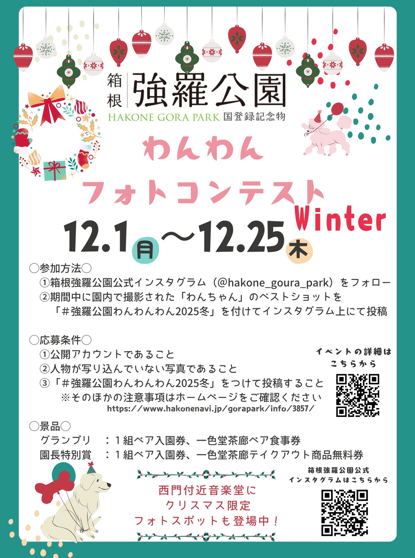クリスマスイベントとあわせて、この夏に大好評だった「わんわんフォトコンテスト」も開催します!クリスマスフォトスポットはもちろん、園内の好きな場所でわんちゃんのとっておきの一枚を撮って応募すると、入賞された方には次回使える入園券と、園内のサンドイッチのお店「一色堂茶廊」のお食事券をプレゼント♪選考方法については、強羅公園職員の投票により決定し、12月29日(月)にインスタグラムダイレクトメッセージにてご連絡します!ぜひ強羅公園で、ホリデーシーズンをたっぷり楽しんでください!⛲️⛲️⛲️⛲️⛲️⛲️⛲️⛲️⛲️⛲️⛲️⛲️⛲️⛲️⛲️⛲️⛲️箱根強羅公園開園時間:9:30〜16:30(最終入園16:00)※箱根強羅公園および園内施設は、天候やメンテナンスのため臨時休業や営業時間が変更する場合があります。※2026年1月1日(祝・木)、1月19日(月)はメンテナスのため、休園いたします。神奈川県足柄下郡箱根町強羅1300強羅駅徒歩約5分(駐車場有)#箱根強羅公園 #強羅公園 #白雲洞茶苑 #箱根登山鉄道 #箱根登山電車 #箱根ロープウェイ #箱根観光船 #箱根フリーパス #箱根クラフトハウス #クラフトハウス #一色堂茶廊 #ローズガーデン #春バラ #花咲く箱根 #箱根 #箱根旅行 #箱根観光 #箱根温泉 #強羅温泉 #箱根スイーツ #神奈川旅行 #神奈川観光 #温泉旅行 #女子旅 #hakone #gorapark